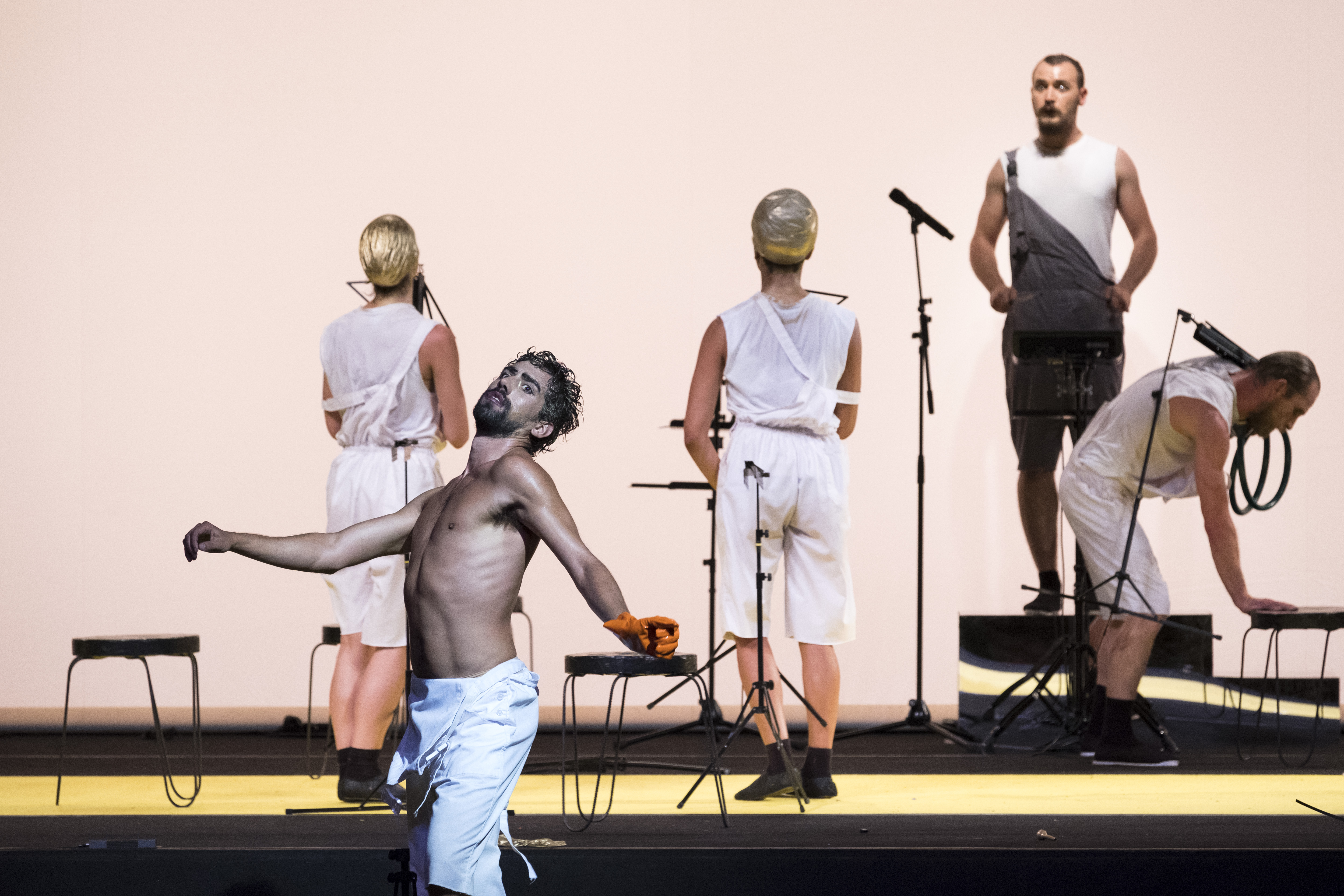 Det vilda och galna är dock märkligt tyglat i Bacchae. Iscensatt som en konsert, med dansarna som instrument framför notställ och med musiker, främst blåsare, som ackompanjemang, är det visserligen grällt och gällt i tonarten men det utlevande är hårt hållet. Det är ett evigt knyckigt marscherande (det rationella?) mest på stället. Med mekaniskt upprepade rörelser, ofta med notställen som verktyg, framställs maskinskrivning (!?), årtag, gevärskjutning, masturbation med mera på ett taktfast vis. Då och då ljuder en siren.