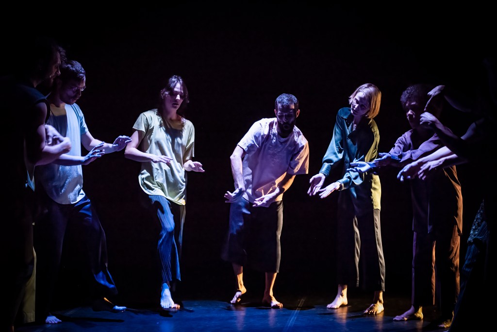 Vi får se en grupp människor röra sig i grupp, i par eller individuellt till en mängd olika rytmer, texter, röster, ramsor, läten, sånger och synkoperingar. Det är ömsom medryckande, ömsom suggestivt men i längden lite småtråkigt. Såvida man inte helt och hållet slutar bry sig om vad man ser och i stället upplever föreställningen som konsert. Då träder man in i en fascinerande ljudvärld med intrikata rytmer, betydligt intressantare än själva rörelsematerialet. Man får lust att dansa själv. Inte minst för att de flesta av dansarna ser ut att ha roligare än man har som publik.
