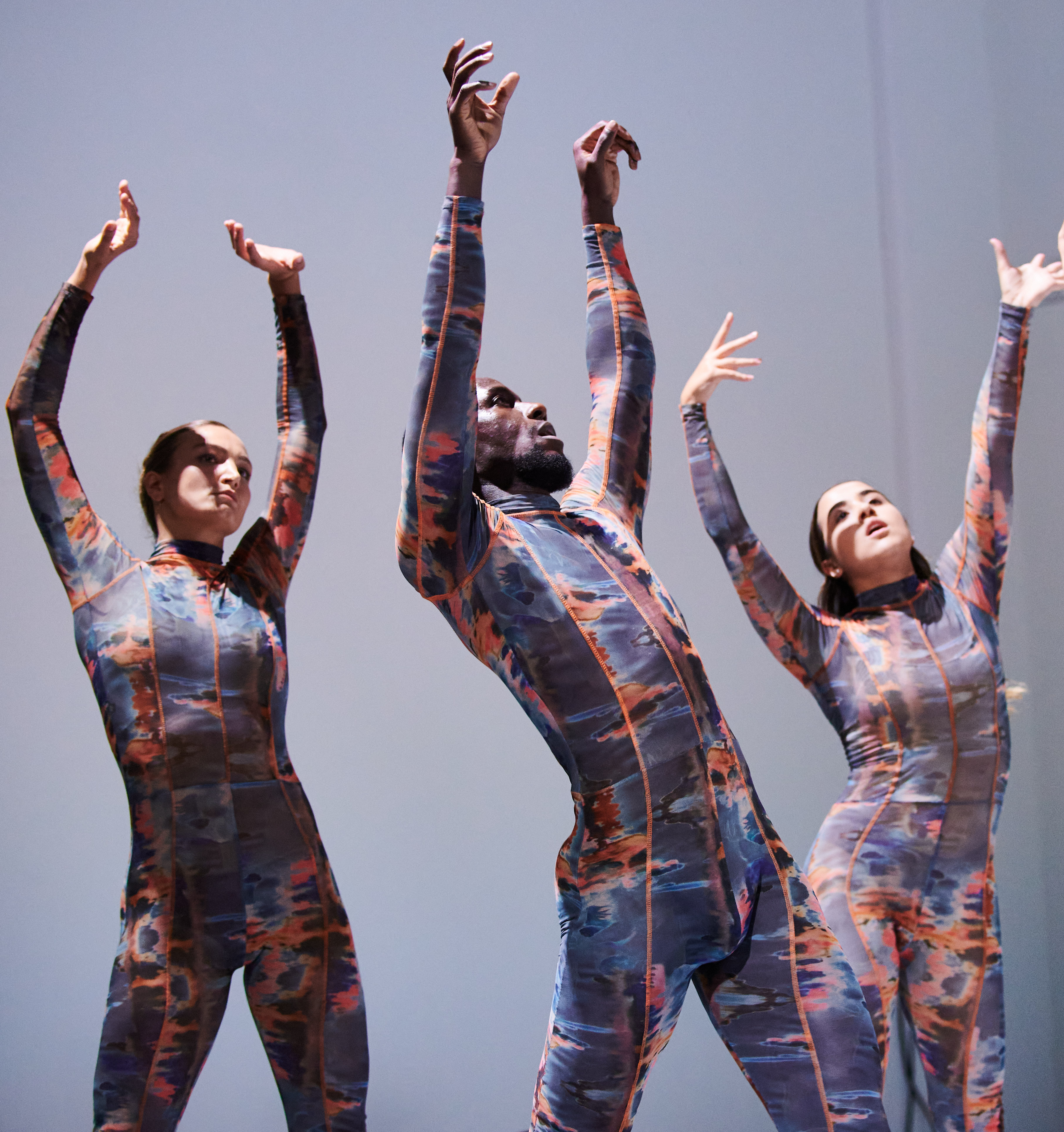 Dansarna ser ut att vara tidsenligt tatuerade över hela kroppen men de visar sig vara iförda hudfärgade trikåer med gråblå mönster. De är först som fastklistrade i golvet men under styckets gång lirkar och svänger de sig upp och går runt som robotar men förmänskligas allt mer för att till sist dansa fullt ut.