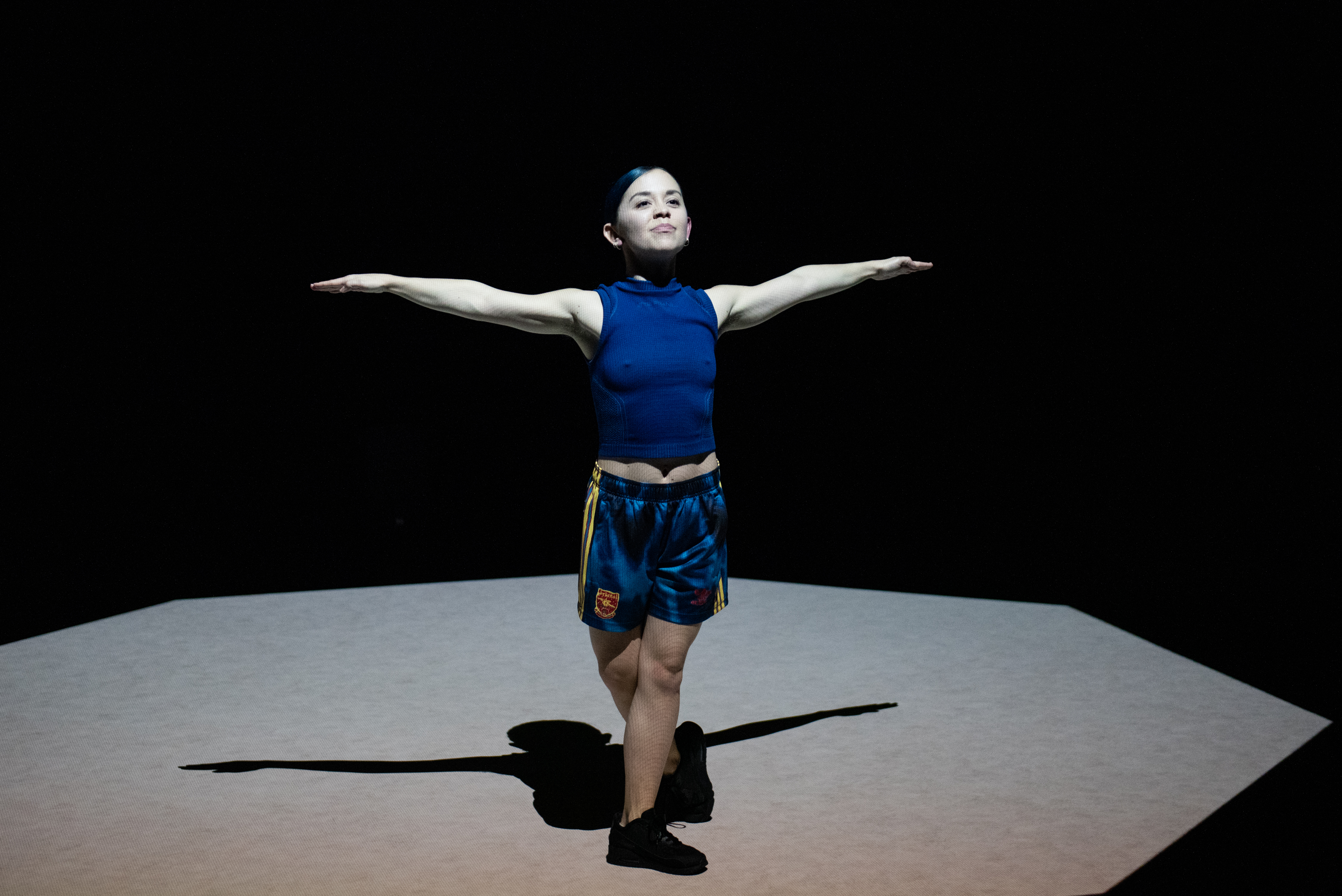 Först ut var Courtney May Robertson, en skotska som sedan 2015 varit verksam som koreograf i Belgien och Nederländerna och då gjort gruppkoreografier. Sedan 2020 turnerar hon i Europa med sitt solo med den långa titeln the pleasure of stepping off a horse when it’s moving at full speed. Inom en oktagonalformad scenyta uttrycker hon dominans och underkastelse med både röst och rörelse. Man skulle kunna kalla henne en ”singer-dancer” som talar, sjunger och dansar. Det sistnämnda utförde hon reptilsnabbt och attackerande distinkt till pisksnärtig hårdrock.