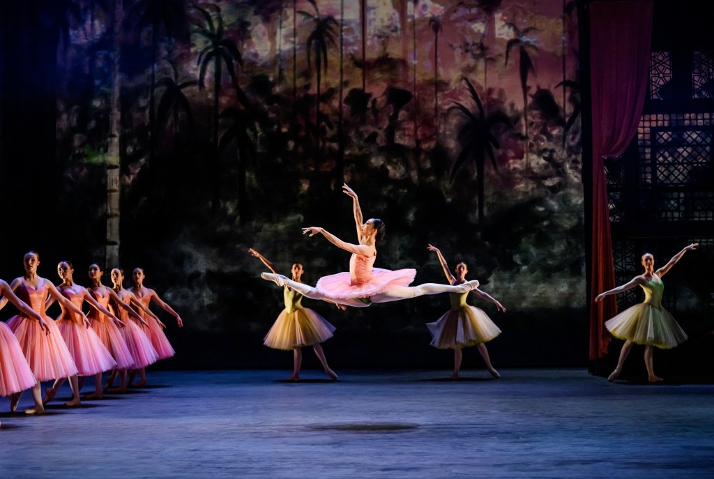 Palmerna vajar, fåglarna flaxar mot skyn och ballerinorna i fluffig marängrosa tyll med pistagegröna inslag är som uppskruvade dockor i perfekt symmetri. Det finns en gotthumörframkallande galen absurdism i denna scen med kontrollerade urverksleksaker och pårökt pascha till taktfast balettmusik med blås.