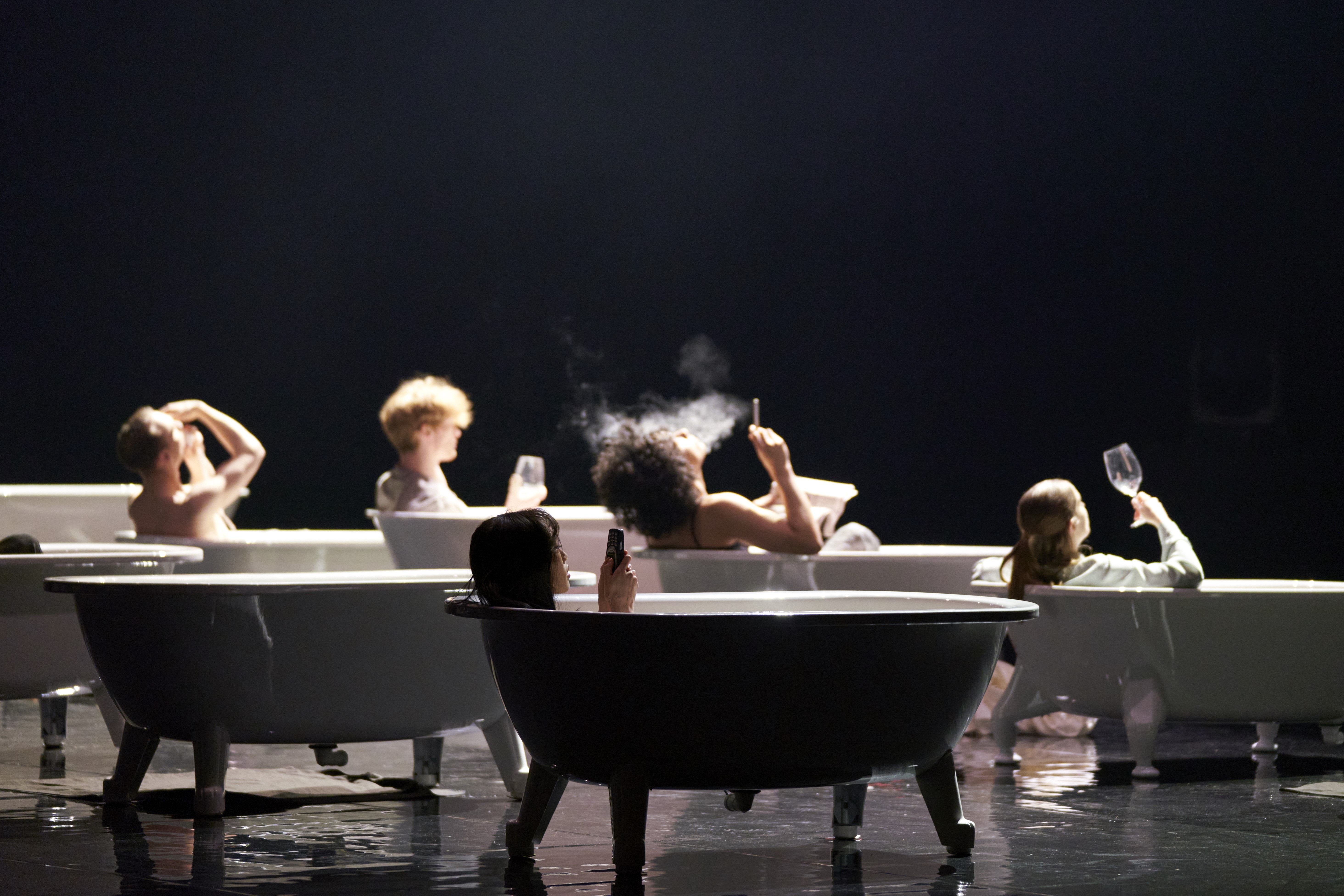 På Kungliga Operan får vi också se människor som äter, sover, slappar eller myser. Och tillika tvagar sig och varandra, trasslar in sig i sig själva och andra, kopulerar, pokulerar, står på huvudet, krälar och promenerar. Och allt sker i eller runt deras badkar.