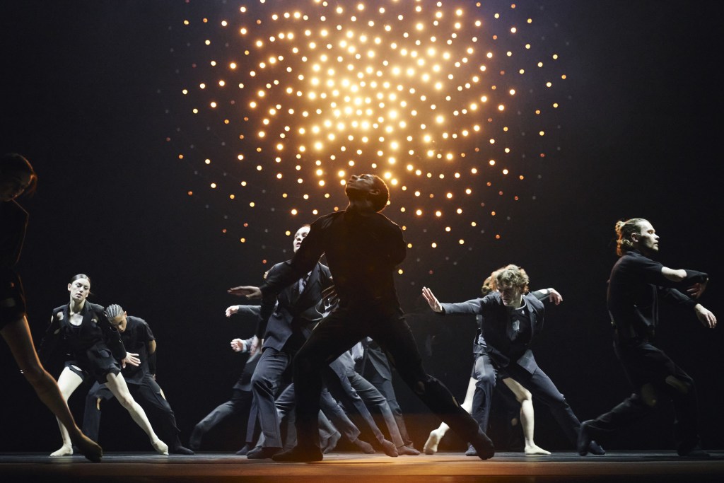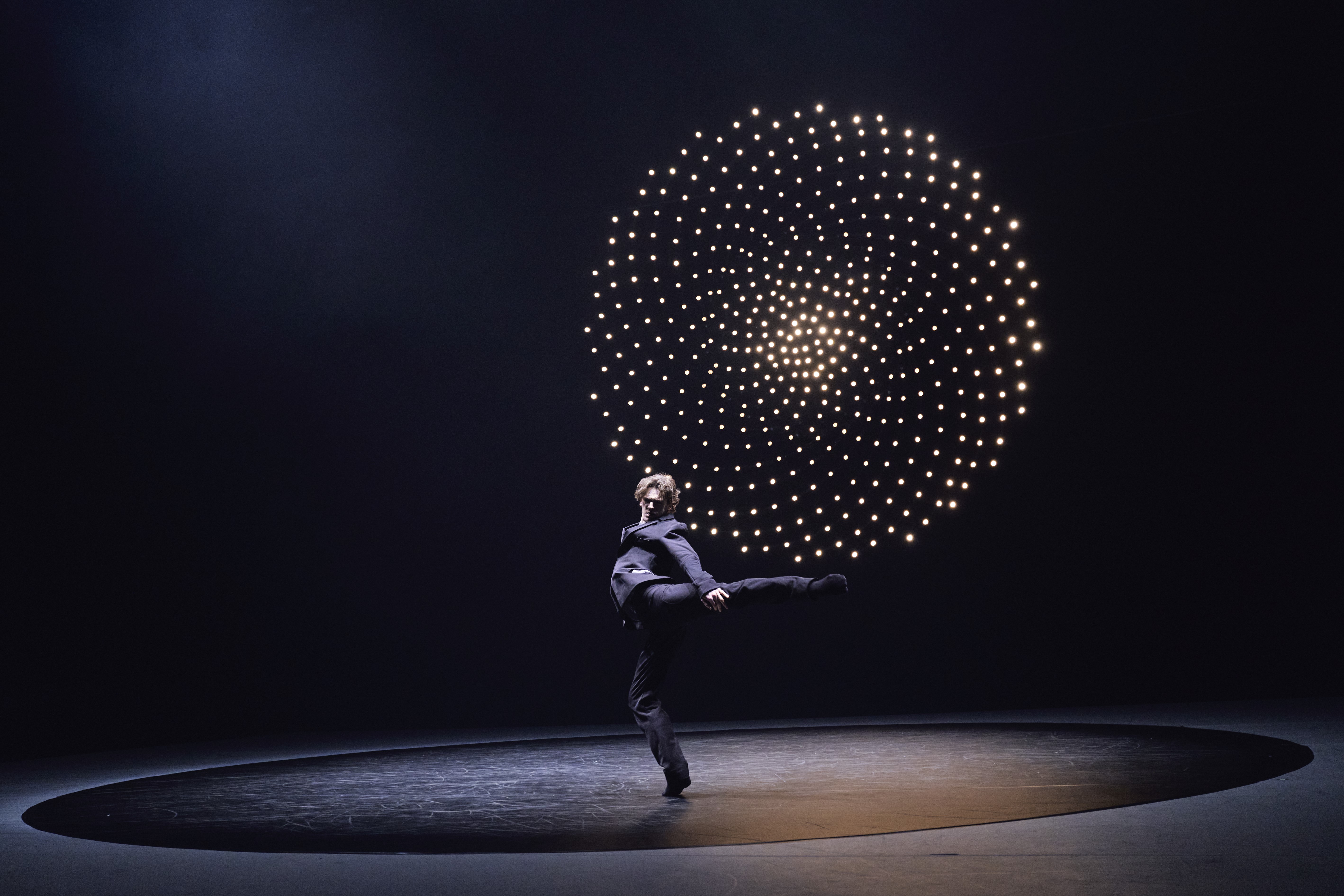 Scenen domineras av en guldglänsande blomma, eller är det ett metalliskt rymdskepp, en sol eller en galax, hur som helst ett jättelikt objekt med spotlights som varierar i storlek och styrka och antal. Dansen, som har en nedåtsträvande modern, jazzig karaktär, skiftar också växelvis i olika konstellationer: hela ensemblen, ytterst samstämd, eller i smågrupper och par mot och med varandra. Likaså solon.