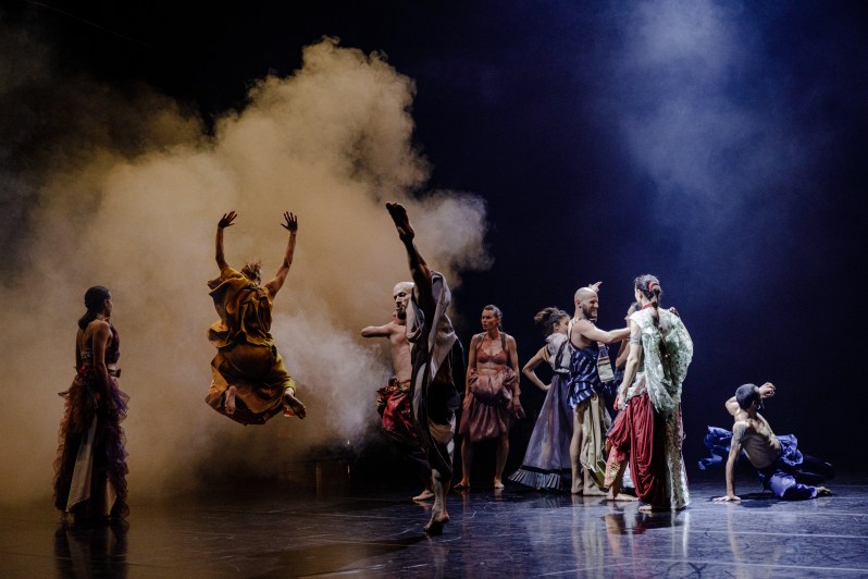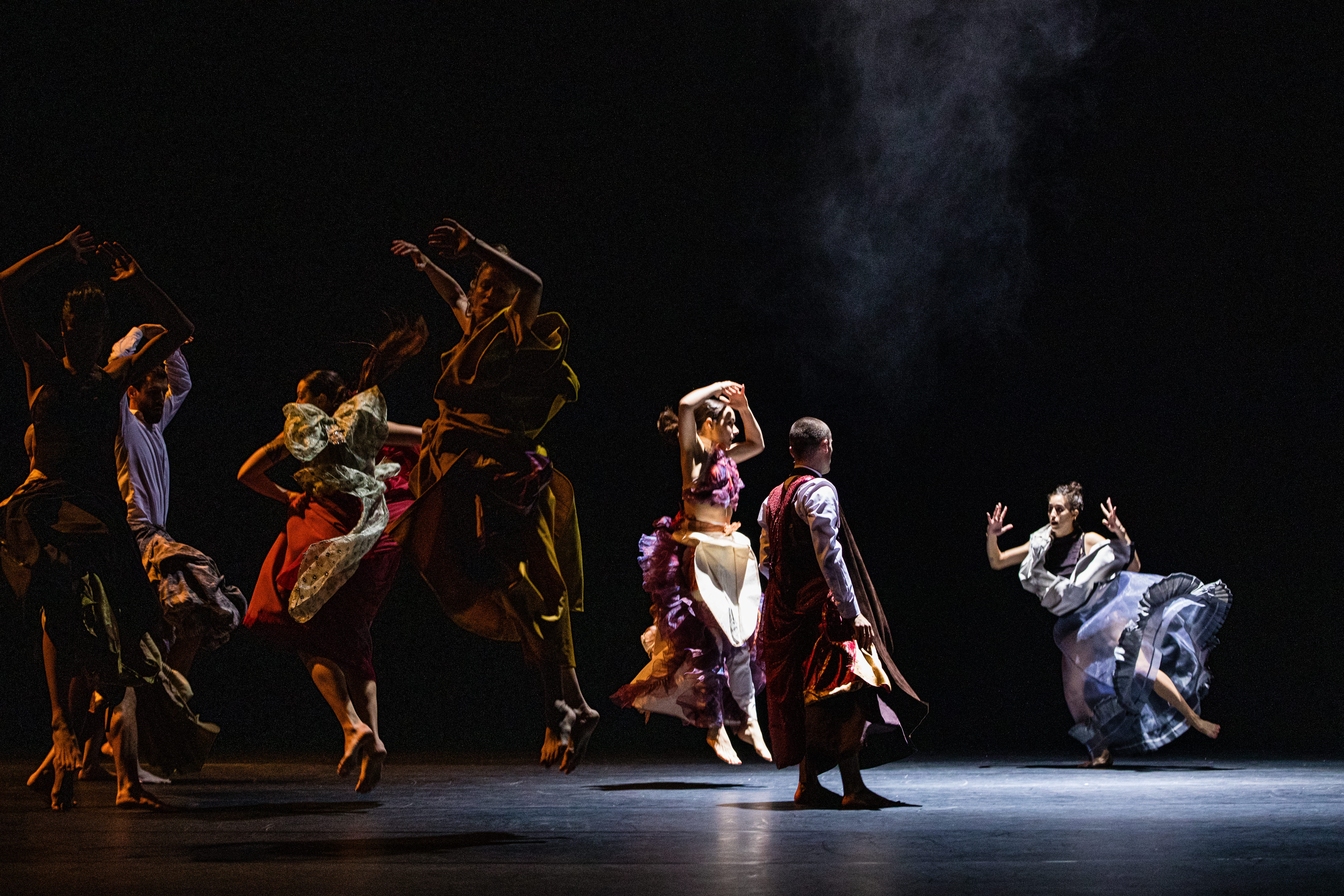 I detta mörker lyser dansarna som fyrbåkar iförda draperade barocklika kreationer i stoffer som skimrar av siden i smörblomsgult, midnattsblått, kakaobrunt, dimgrönt, rosalila, purpur med guldinslag och kviltat svart. Kostymen som är av Thomas Bradley, tidigare dansare i Emanuel Gat Dance, är närmast kubistiskt ihopsatt påminnande om avant-gardemodet hos Vivienne Westwood eller Alexander McQueen.